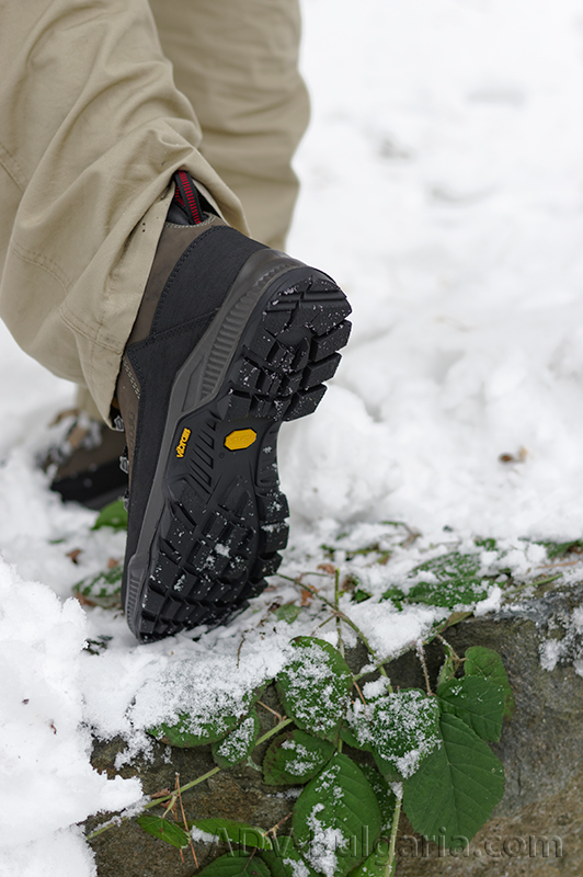 По отношение на реалните тестове, обувката е наистина доста „корава“ и плътно прилепва по крака. Доста е твърда, за мен направо изненадващо твърда, но това определено е плюс по скалистите терени на високите ни планини. Крака е обхванат здраво и стегнато и се чуства стабилно като в зимна обувка от висок клас. На сняг и в неравен терен обувката не се хлъзга, държи стабилно и на сняг, и на мокра трева, и на камъни.