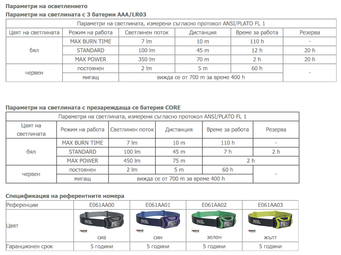 - Захранване: 3 батерии AAA/LR03 (продават се с челника) или презареждаща се батерия CORE (предлага се като аксесоар)