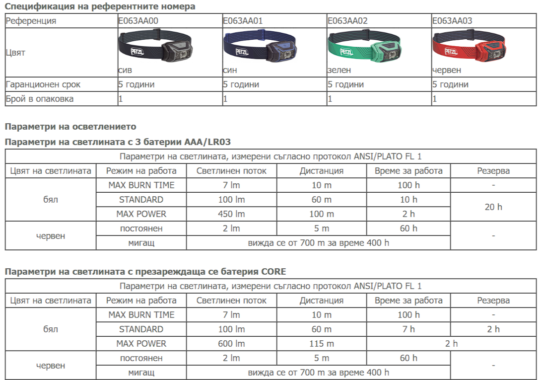 - Захранване: 3 батерии AAA/LR03 (продават се с челника) или презареждаща се батерия CORE ( предлага се като аксесоар, купува се отделно)