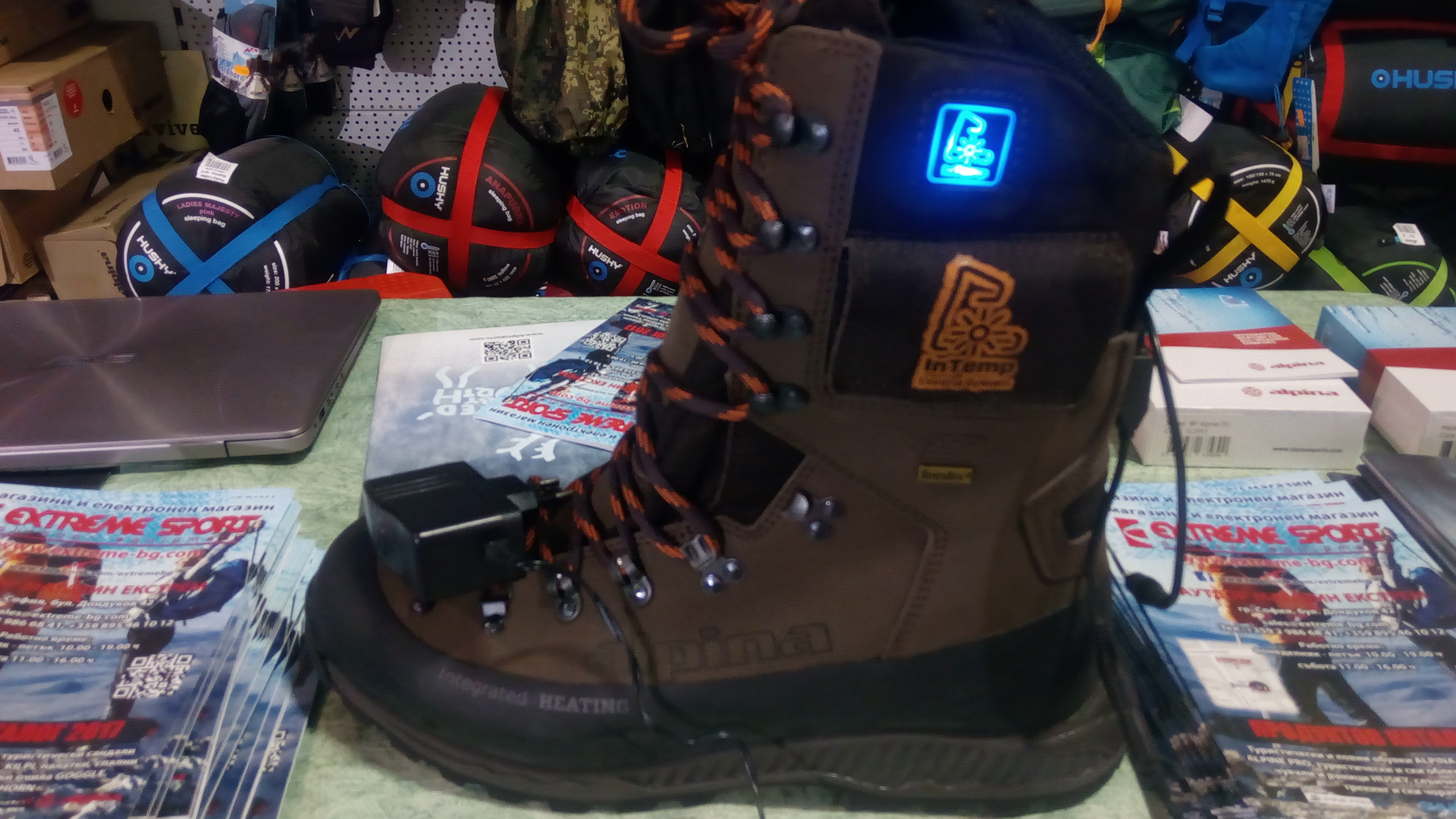 Обувките са снабдени с батерии и нагреватели, монтирани в областта на пръстите и петите, и поддържат постоянна температура в продължение на 6 часа. По този начин се осигурява топлина за ходилата независимо от атмосферните условия.