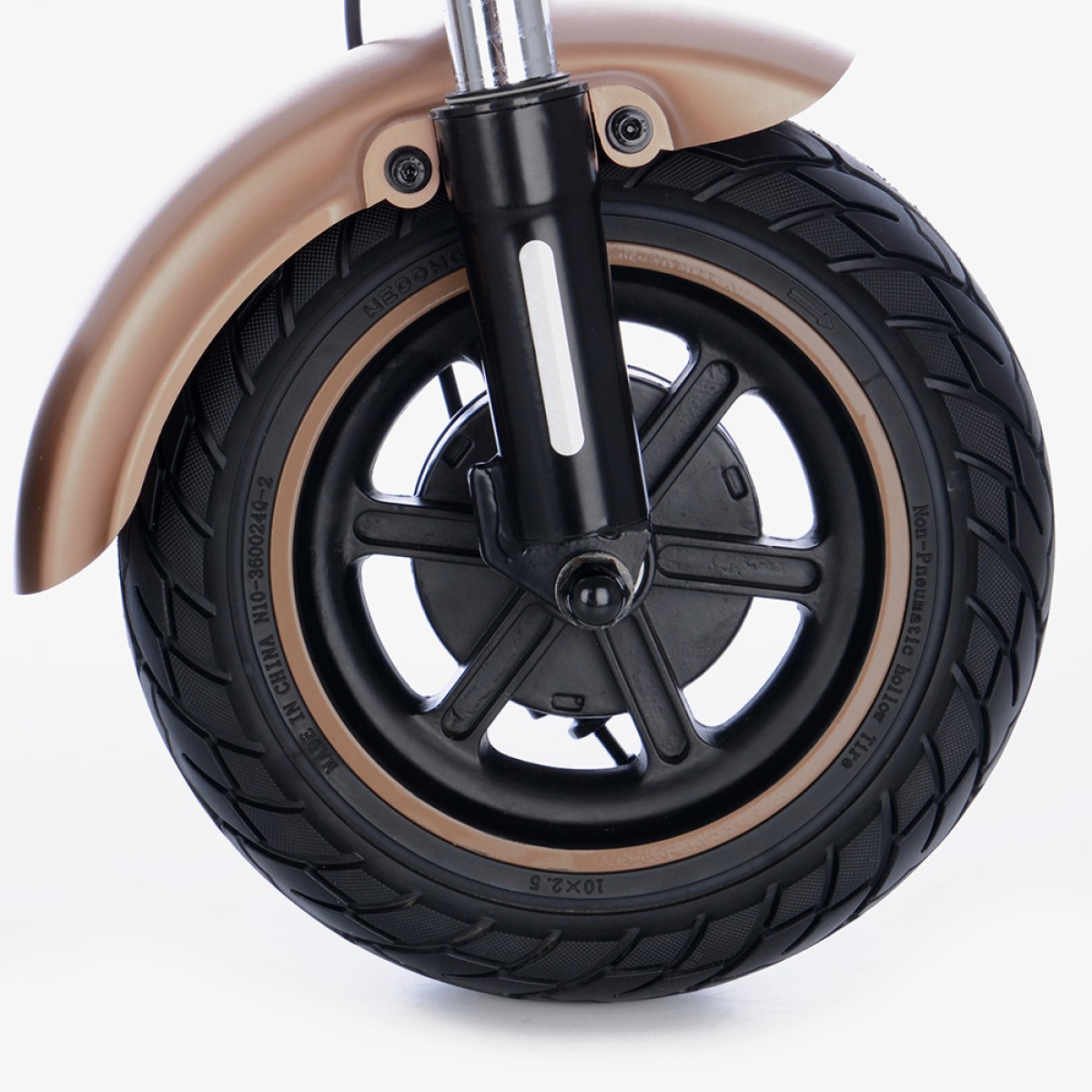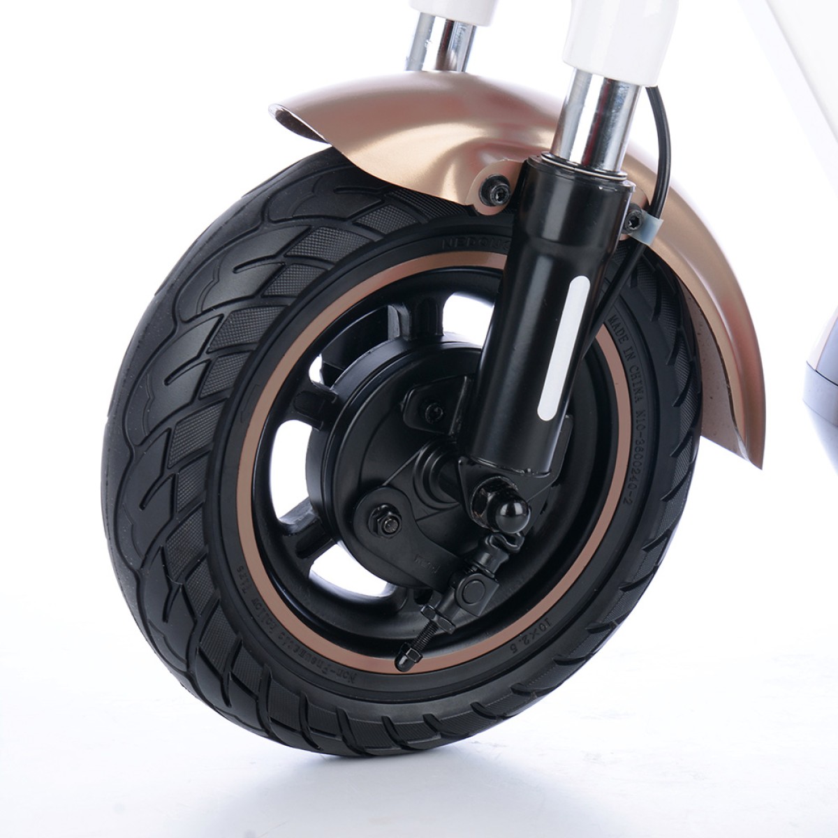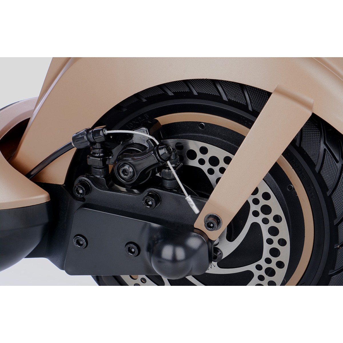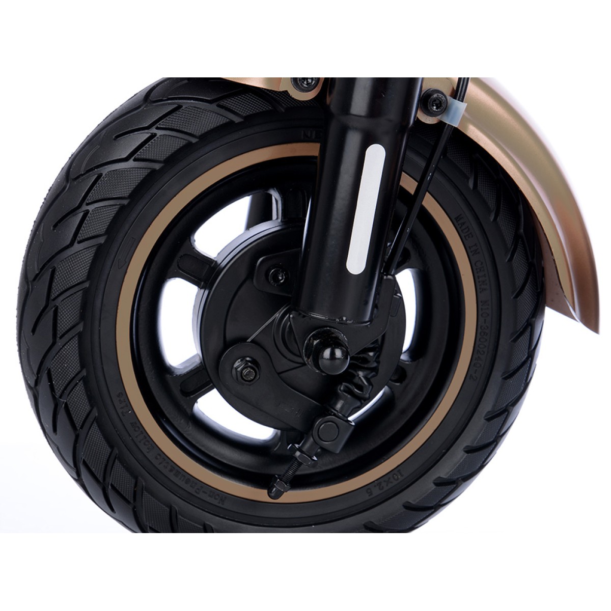 Безгрижното каране се осигурява от безкамерни гуми 10x2.5", които никога не се пробиват и преодоляването на препятствията е по-лесно благодарение на големия им диаметър. По-голямата ширина на гумата също спомага за стабилността на пътя. И предната, и задната вилка са пружинирани за удобно каране дори и на неравните повърхности.Задния калник е подсилен за да елиминира счупване и неприятни звуци при преминаване през неравности.