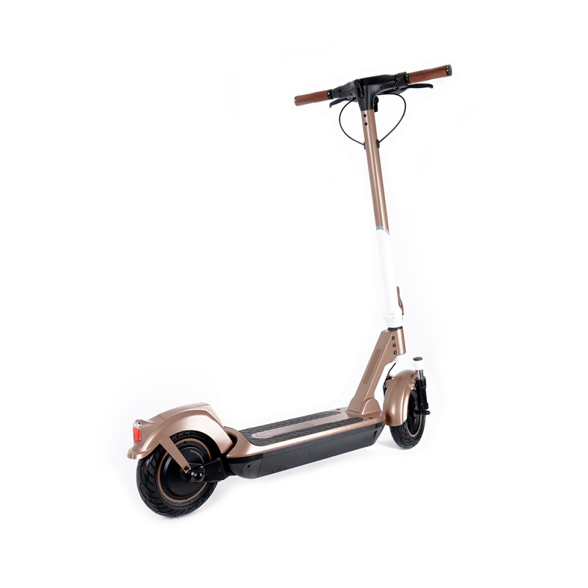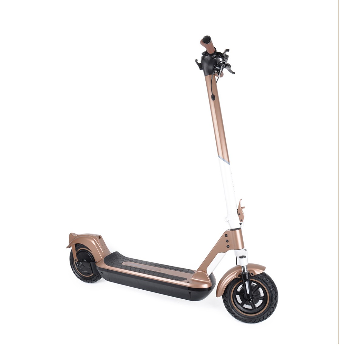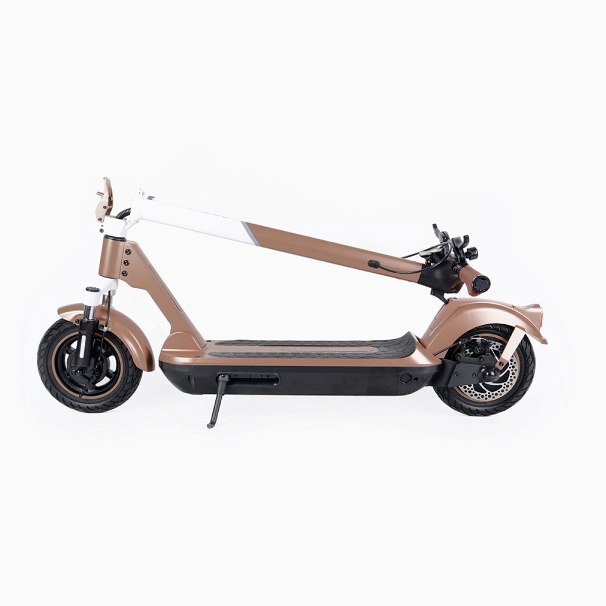 Безгрижното каране се осигурява от безкамерни гуми 10x2.5", които никога не се пробиват и преодоляването на препятствията е по-лесно благодарение на големия им диаметър. По-голямата ширина на гумата също спомага за стабилността на пътя. И предната, и задната вилка са пружинирани за удобно каране дори и на неравните повърхности.Задния калник е подсилен за да елиминира счупване и неприятни звуци при преминаване през неравности.