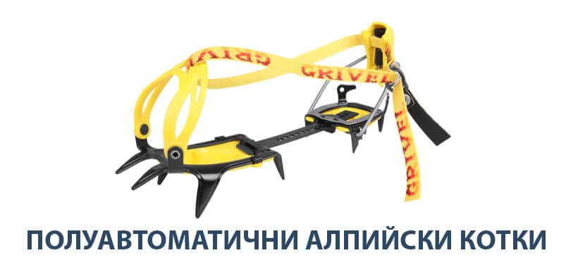 - Полуавтоматични – Закрепват се чрез притискане с каишка отпред и затягане с автомат отзад. Закрепването е много добро, а изборът на полуавтоматични котки е подходящ за почти всякакъв вид катерене. Подходящи са за обувки с жлеб отзад. Примерно моделите Nuptse и Aosta на словенската марка Alpina.