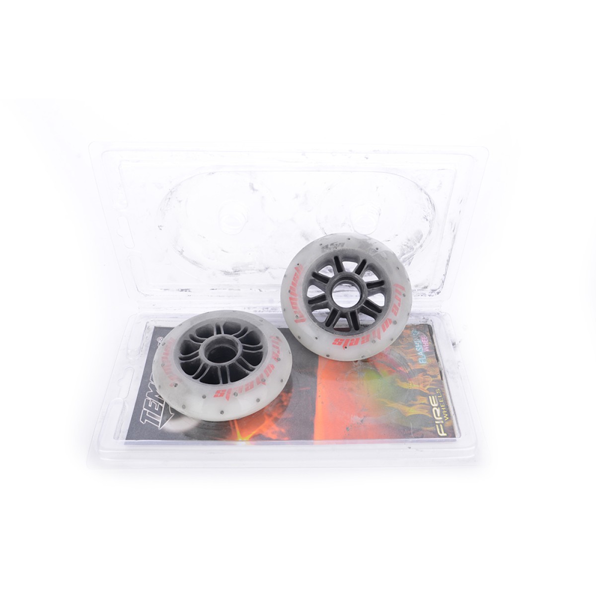 Комплект колела за ролери. Те са с вградени камъчета, които при съприкосновение с повърхността ги карат да блестят и искрят при каране. .