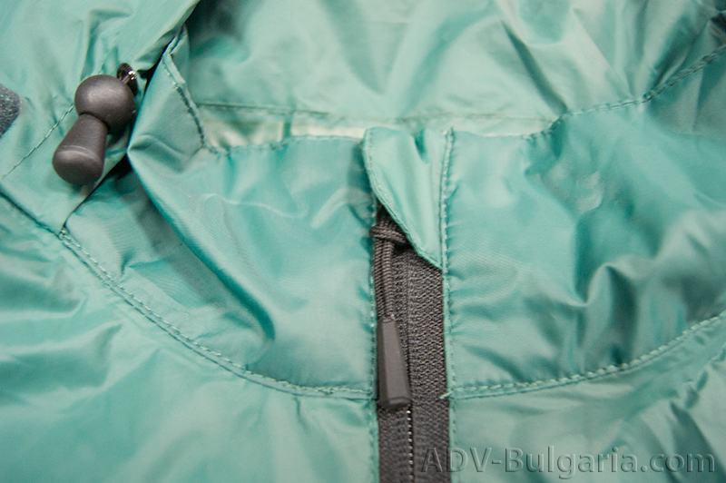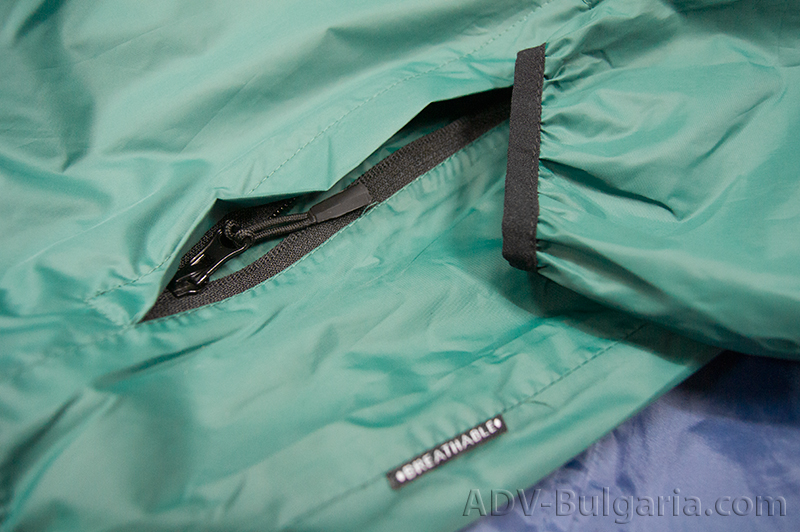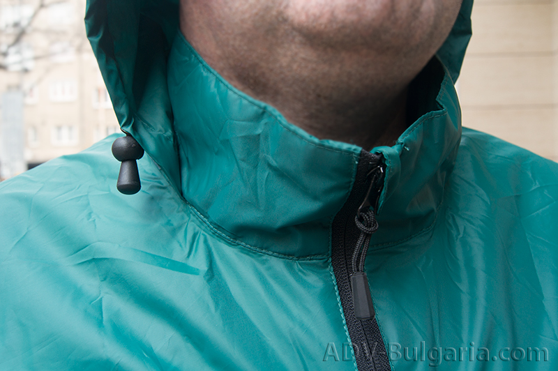 Впечатляващо, нали? Идеално се побира в джоба на всяка раница, може да бъде закачено отвън ( има си нужната кукичка и ластична връзка за пристягане) и на всичкото отгоре тежи само 300 грама. 300 грама, в които се крие напълно функционално яке от дишаща материя, с лепени шевове, способно да понесе 5000 мм воден стълб. Да, 5000 милиметра и от теста и снимките по-долу ще се убедите, че го прави с лекота. Като казвам функционално, имам в предвид и качествени ципове, които в закопчано състояние плътно покриват заципващия механизъм.