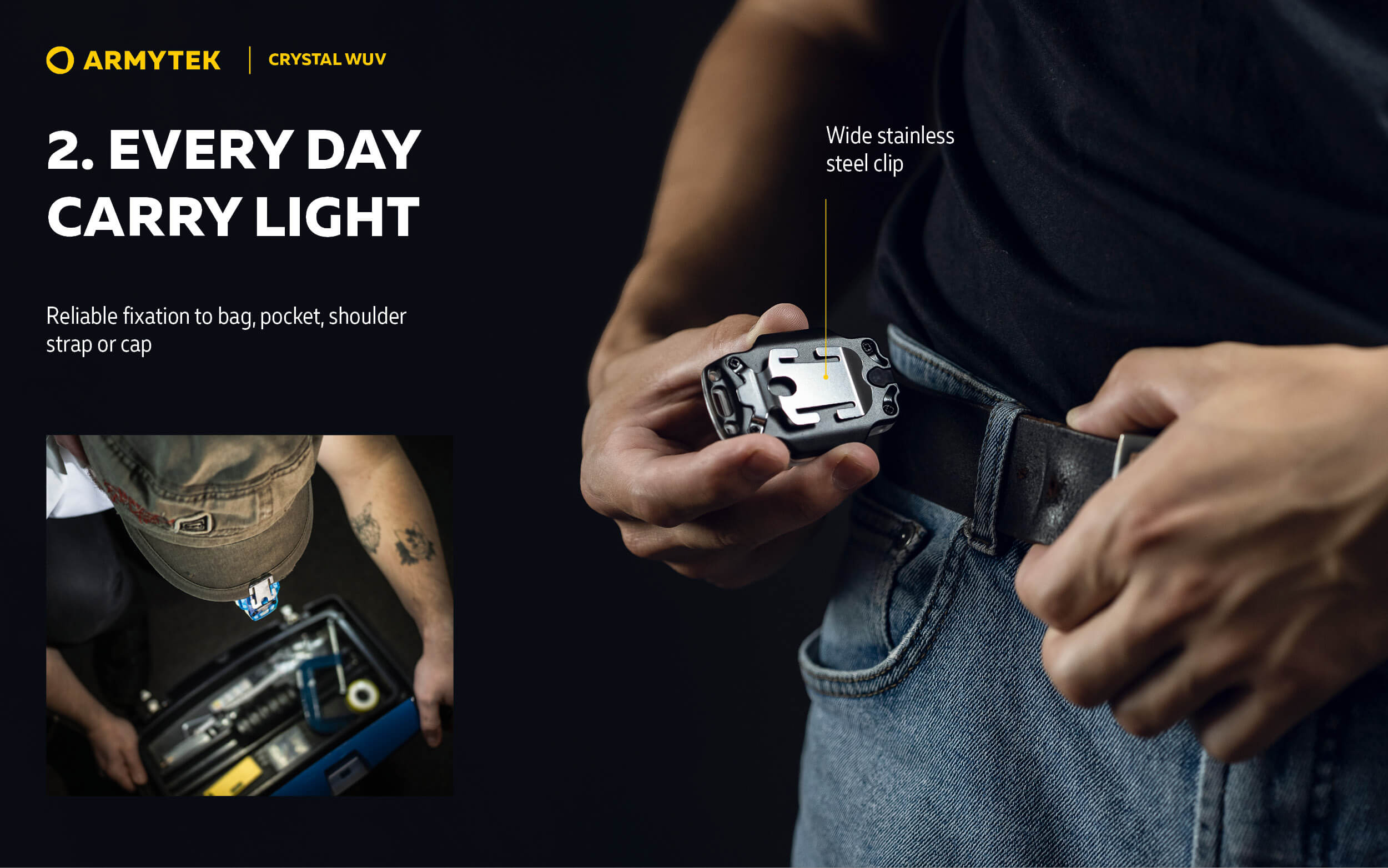 С тегло само 34 грама, компактният мултифункционален фенер е удобен за носене в джоб или чанта заедно с ключове. Може да се фиксира и на главата с лентата за глава или да се прикрепи към дрехи, колан или презрамка на раница с щипка. В допълнение към това, комплектът включва удобен шнур за носене на китката или около врата. С издръжливия шнур, Crystal WUV може да се окачи на клон на най-близкото дърво или на кука под тавана на палатка, за да освети къмпинга по време на екскурзия сред природата.