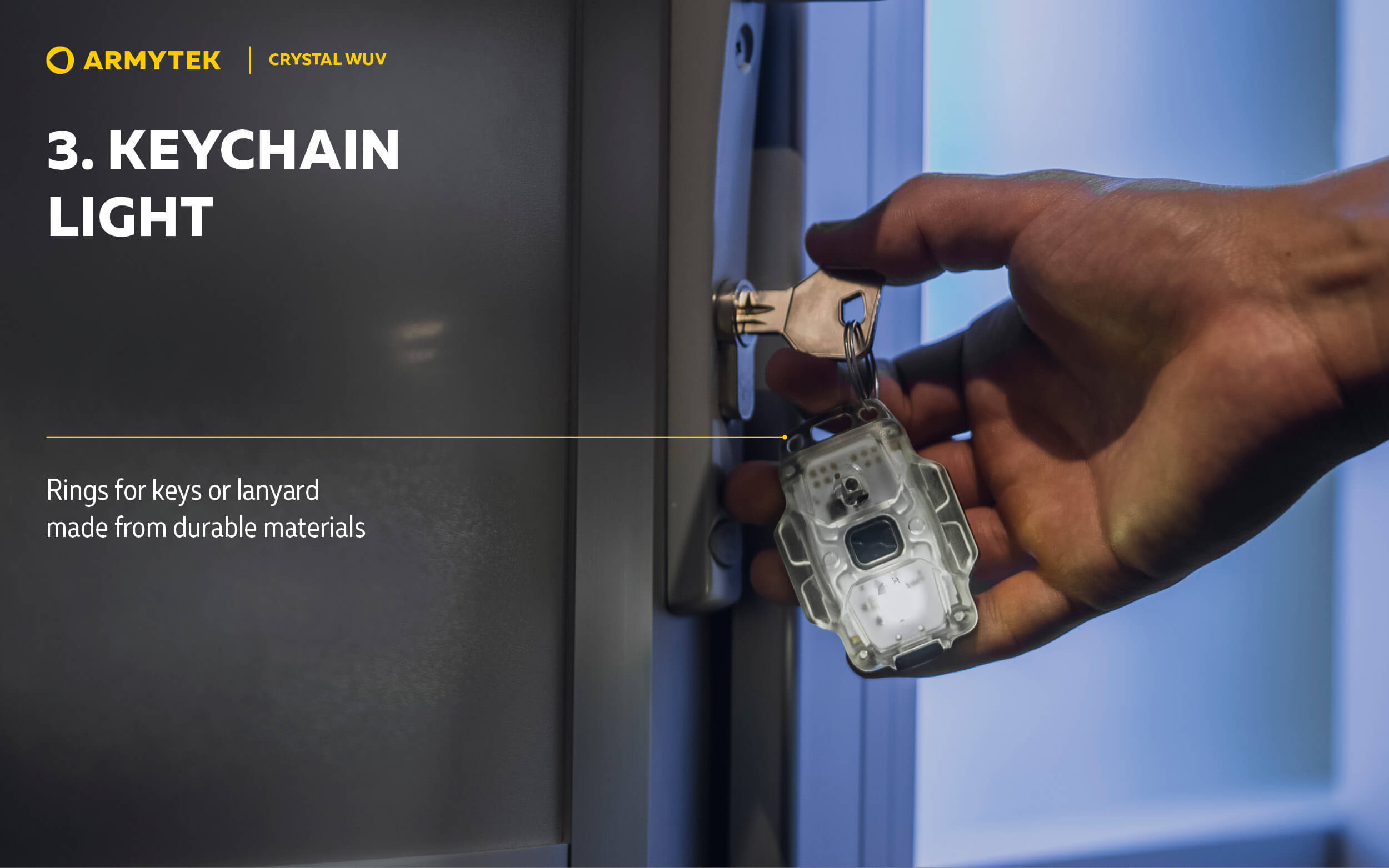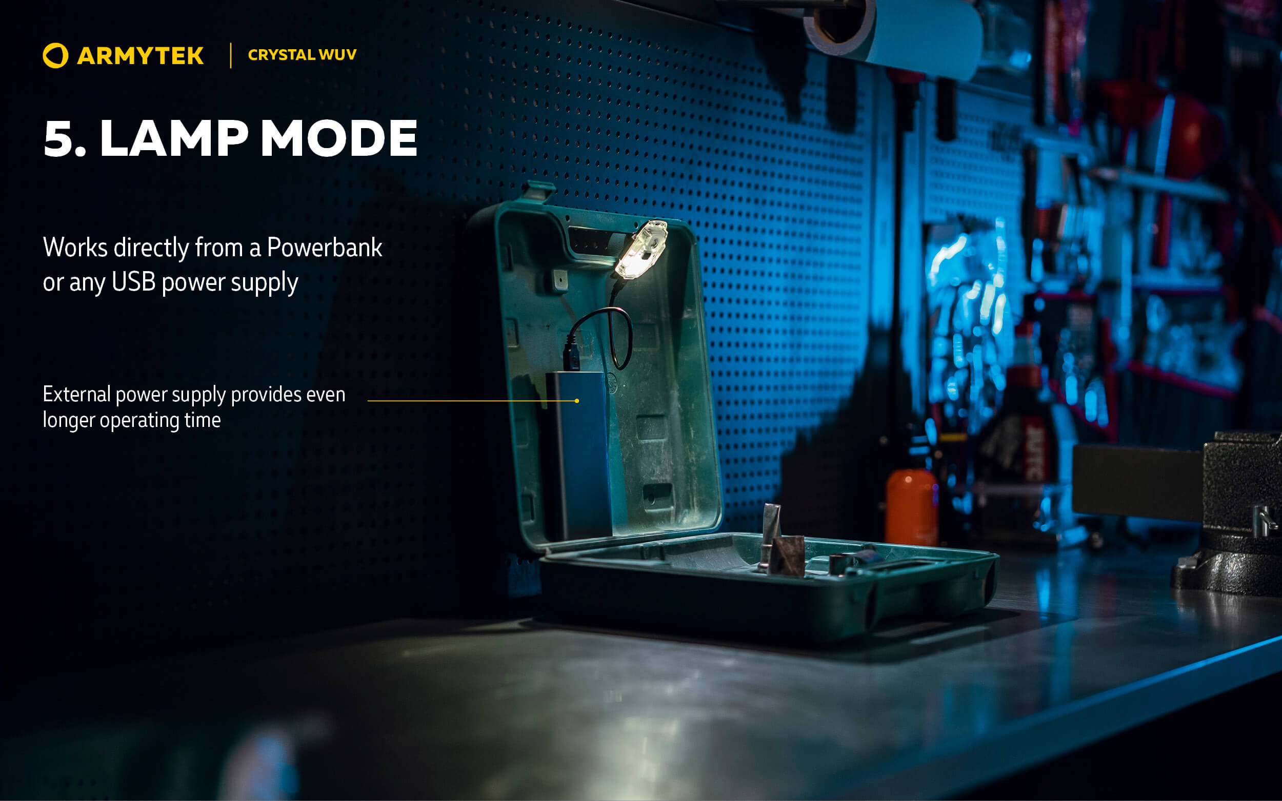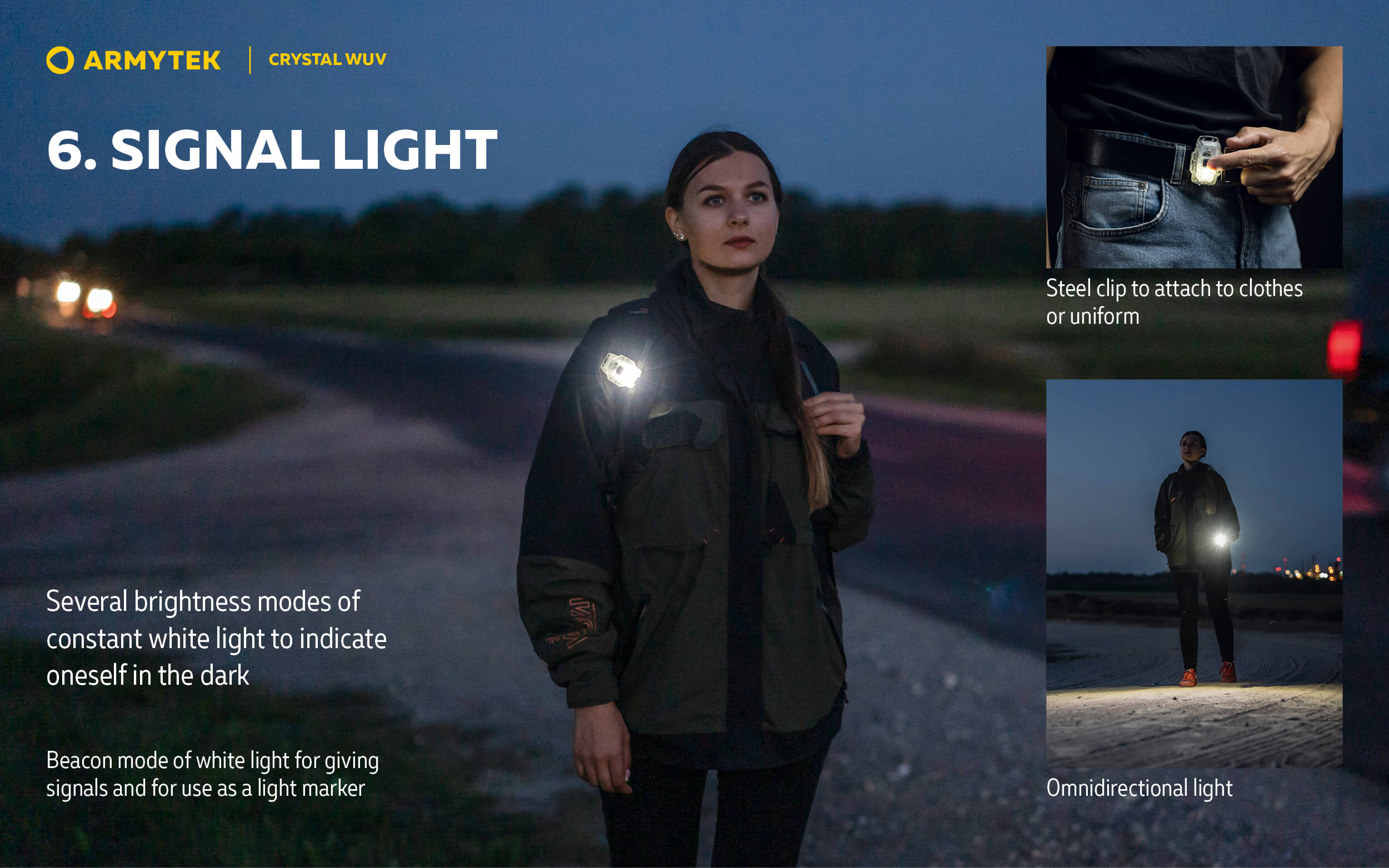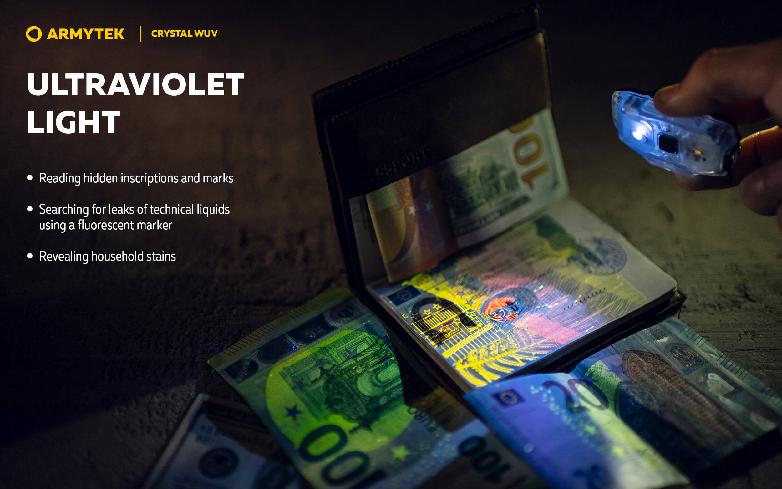 Crystal WUV е универсален модел от серията Crystal с бяла и ултравиолетова светлина. Подобно на другите компактни мултифункционални фенерчета Armytek, Crystal WUV осигурява широк светлинен спектър за използване от близко разстояние по време на вечерна разходка, джогинг или изпълнение на задачи при условия на слаба светлина.