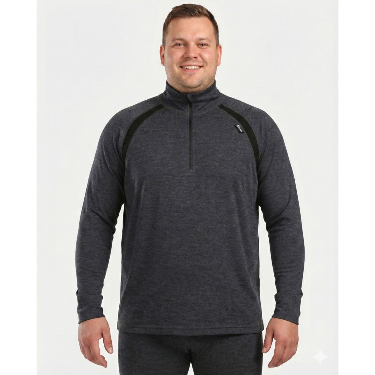 Висок клас мъжка термо блуза Kilpi JAGER-M от 100% Мериносова вълна. Модел с висока яка и цип за терморегулация. Антибактериална, топла и дишаща – идеалният първи слой.Специална серия с разширена номерация (до 7XL), осигуряваща комфорт и еластичност за по-едри фигури.