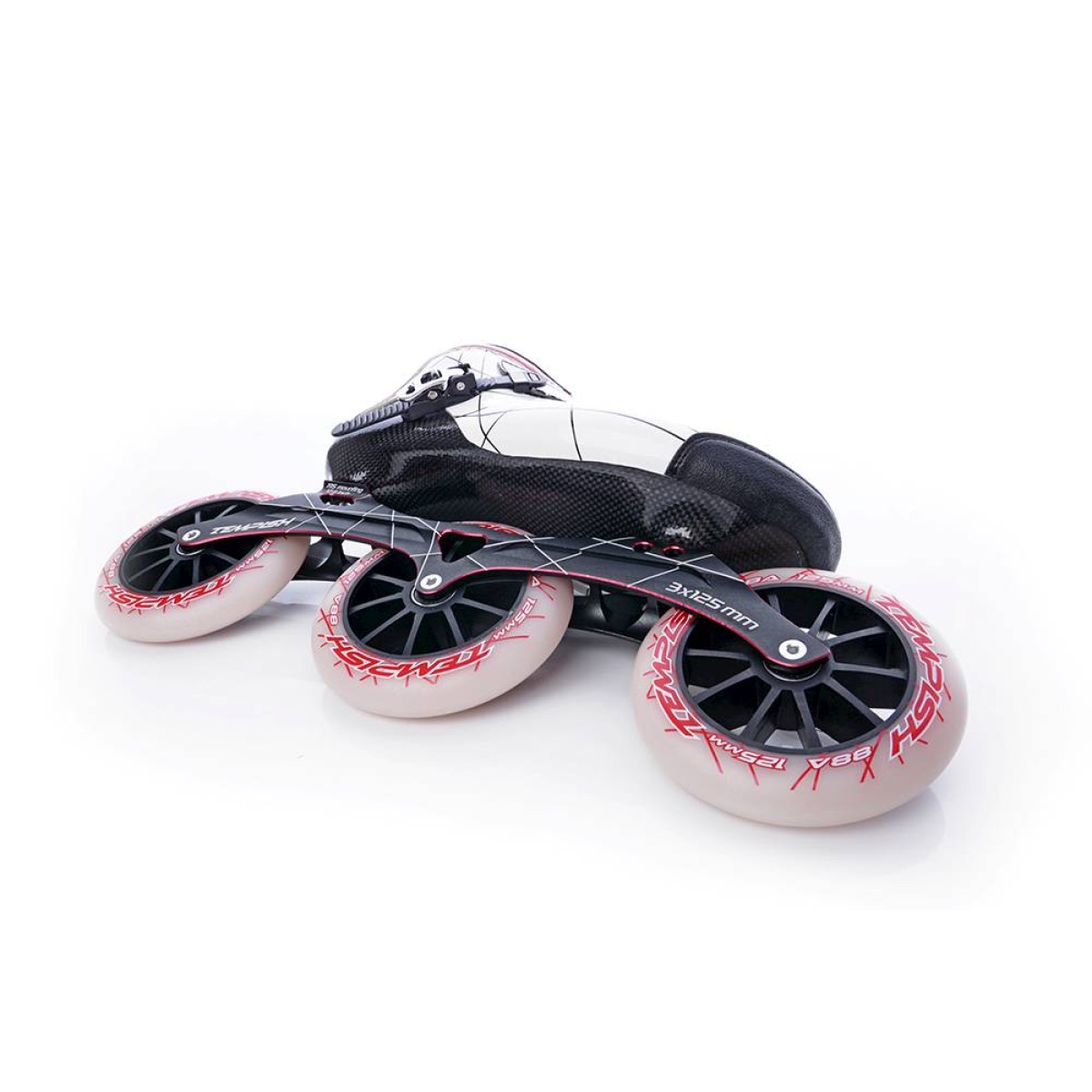 - Шаси: 3 BW - шаси за 3 колела 125 мм, изработено от изключително здрава сплав AL 7005, фиксирано от централни болтове с регулиране на страничната им позиция спрямо обувката