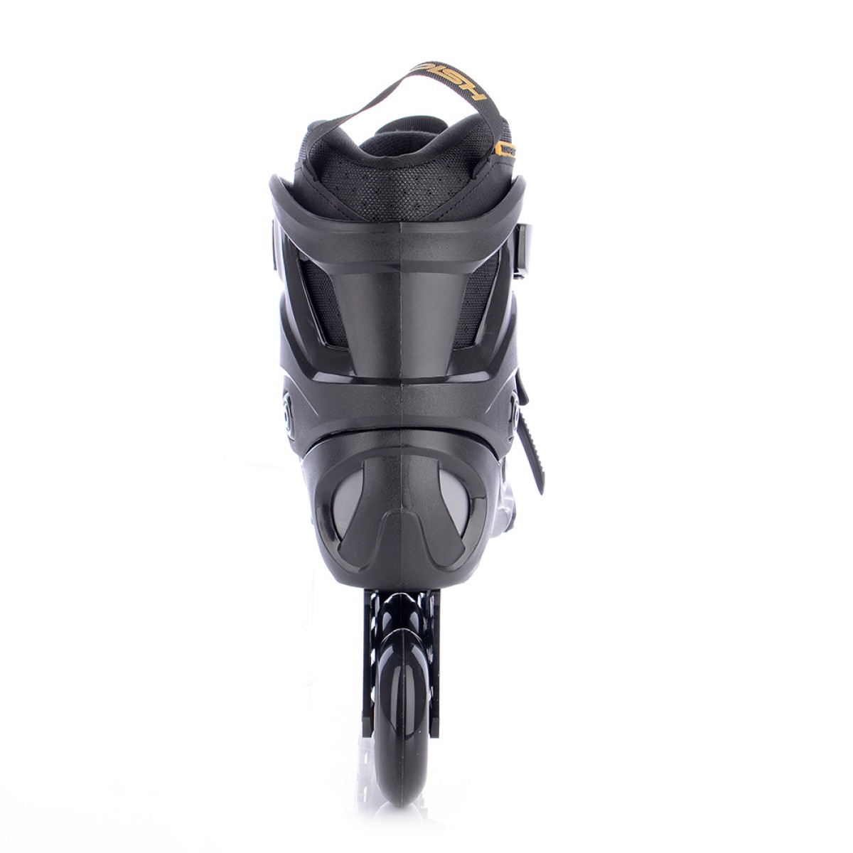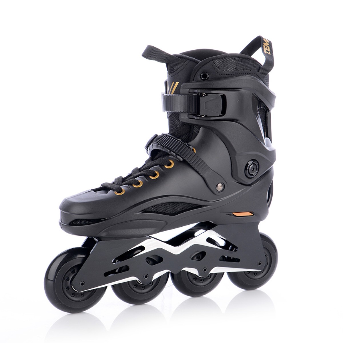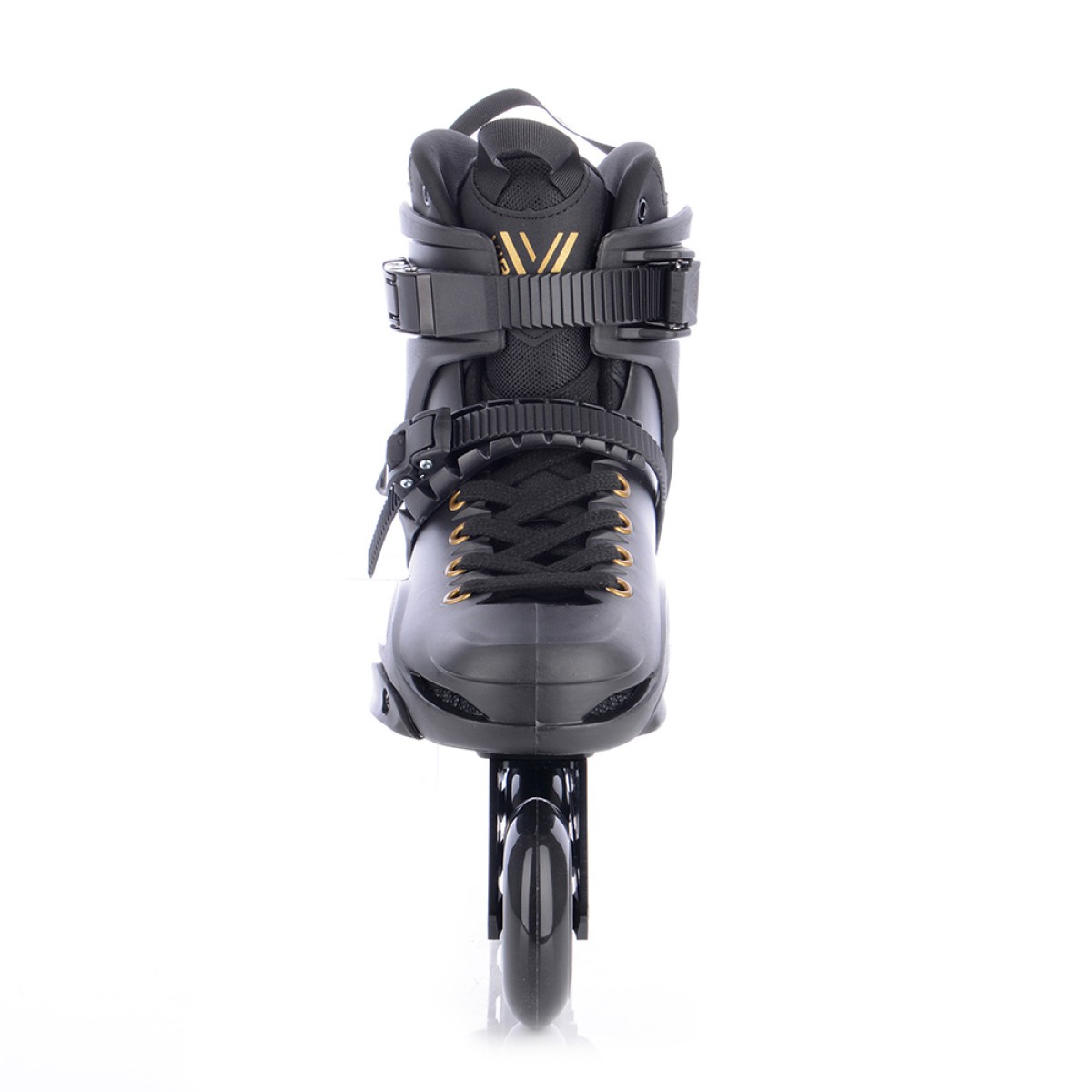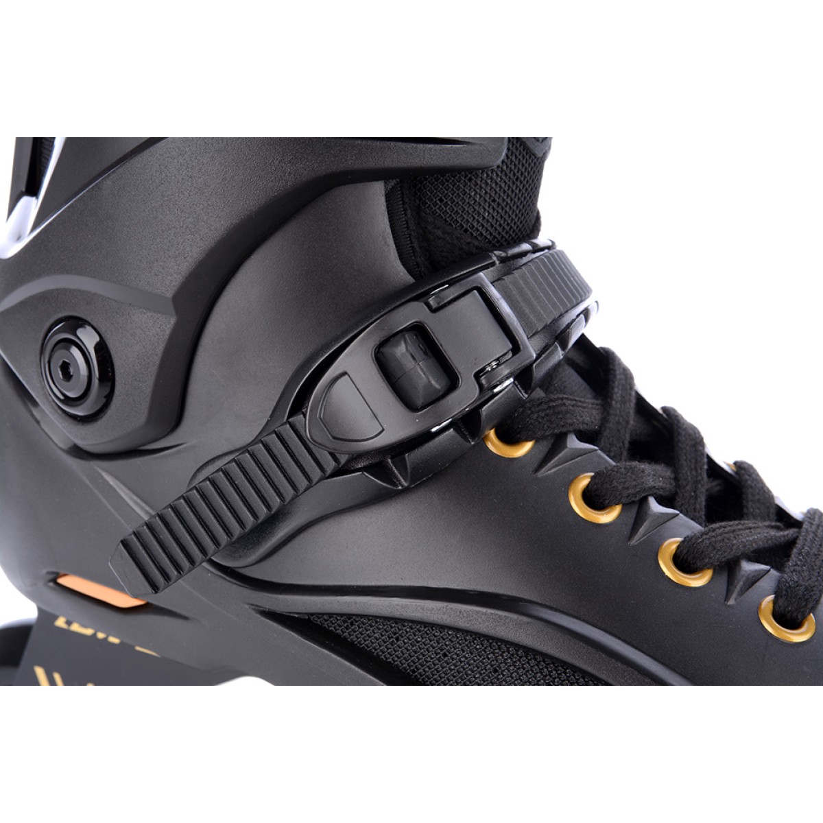 The skate shell is well-ventilated, with ventilation reaching the foot thanks to holes on the bottom of the boot and a ventilated liner featuring perforations around its circumference, including the tongue. The cuff is attached with a screw and special nut and washer, making it replaceable and allowing for easy tightening. This setup ensures greater durability than a riveted joint. The top self-locking buckle is made of metal. The strap is inserted into the shell to avoid catching on the other skate during slalom and freestyle manoeuvres. Thanks to a ratchet system, the instep strap features a single-stage micro buckle for comfortable tightening and loosening. The laces are waxed, which makes them less slippery and easier to tighten.