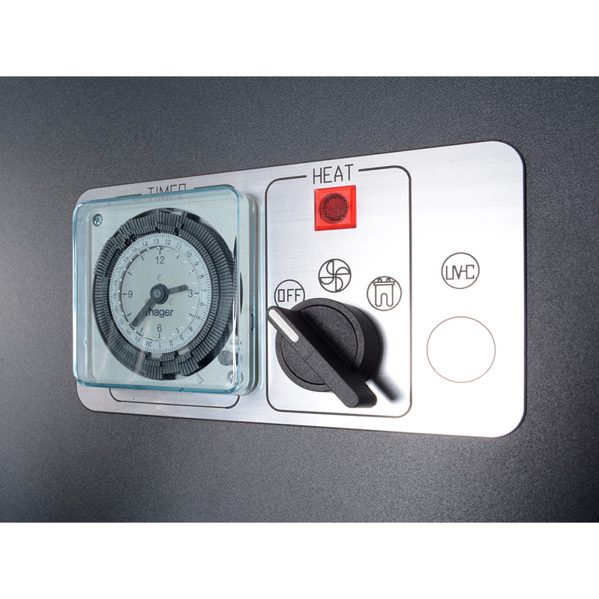 It is equipped with a timer for programming the start and a thermostat for setting the air temperature at the outlet of the dryer. Control is very simple and intuitive